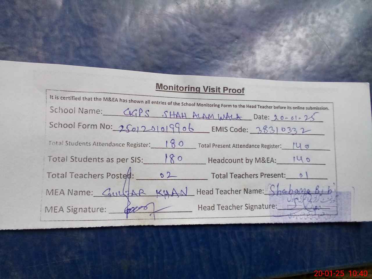 | Attendance Register | Head Teacher | MEA with School | Visit Proof |