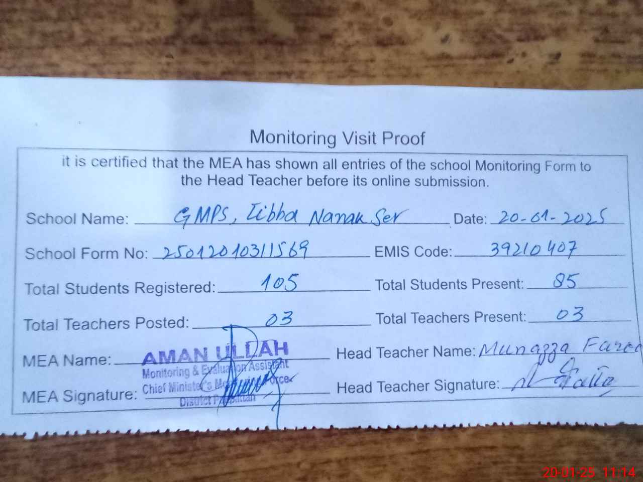 | Attendance Register | Head Teacher | MEA with School | Visit Proof |