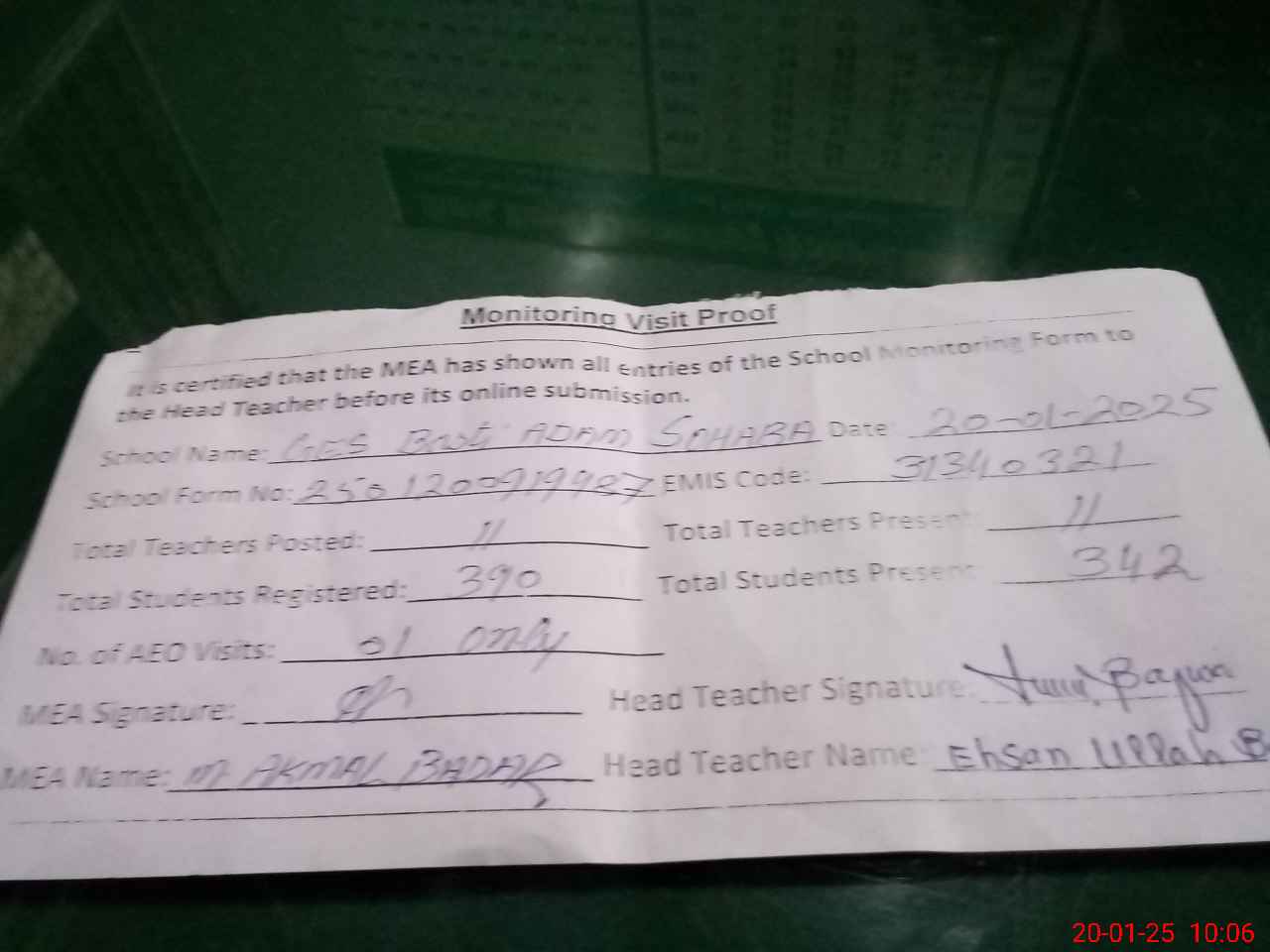 | Attendance Register | Head Teacher | MEA with School | Visit Proof |