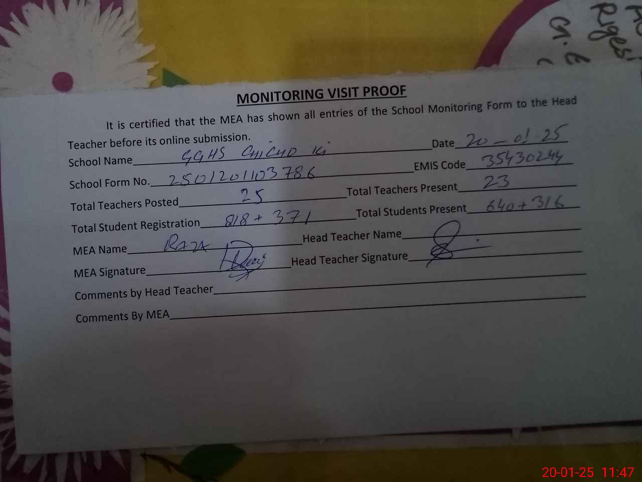 | Attendance Register | Head Teacher | MEA with School | Visit Proof |