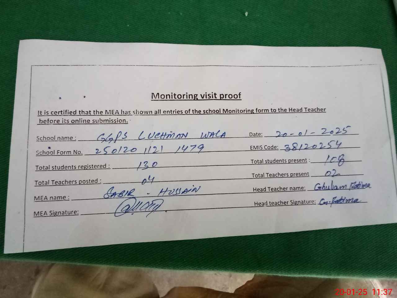 | Attendance Register | Head Teacher | MEA with School | Visit Proof |