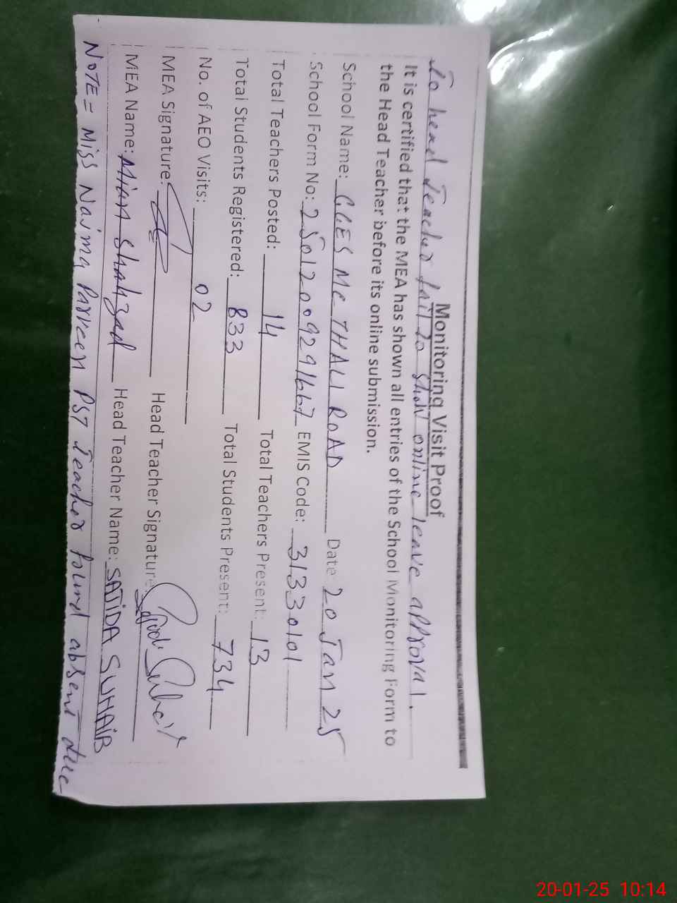 | Remarks (Use Separate Page if Required): Miss Najma Parveen PST teacher found absent from school during visit due to head teacher fail to show online leave approval | |||||