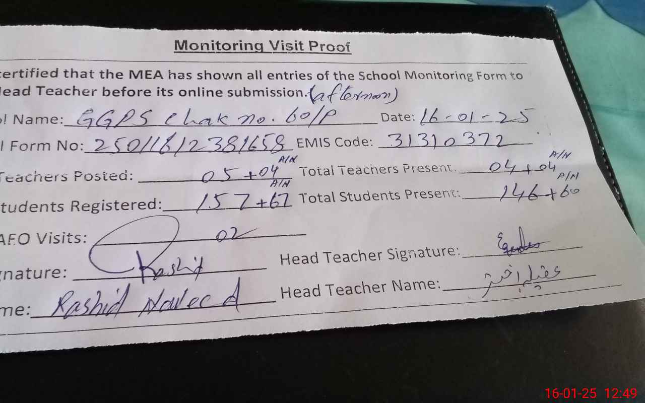 | Attendance Register | Head Teacher | MEA with School | Visit Proof |