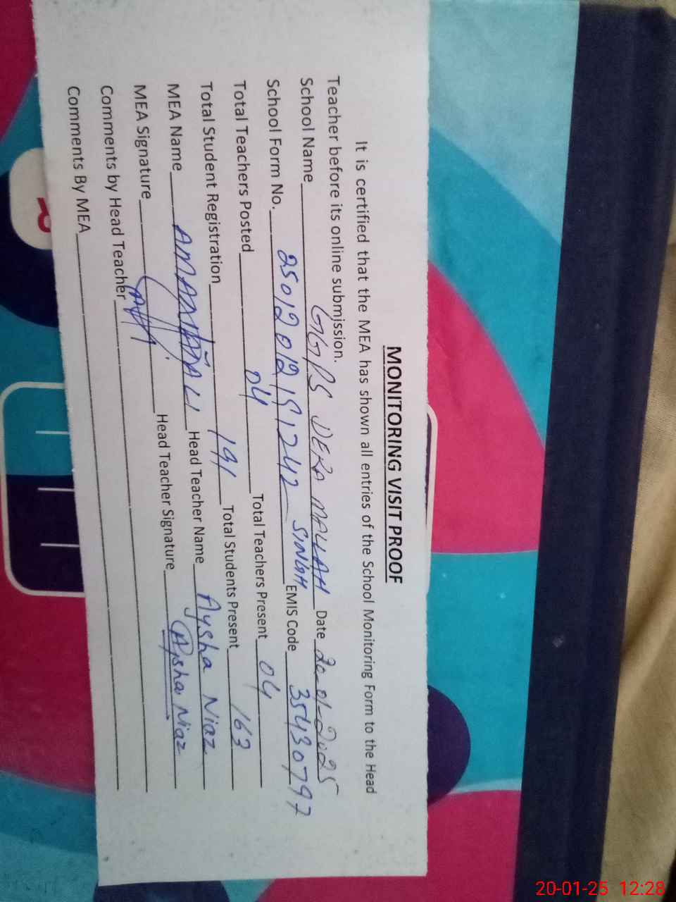 | Attendance Register | Head Teacher | MEA with School | Visit Proof |