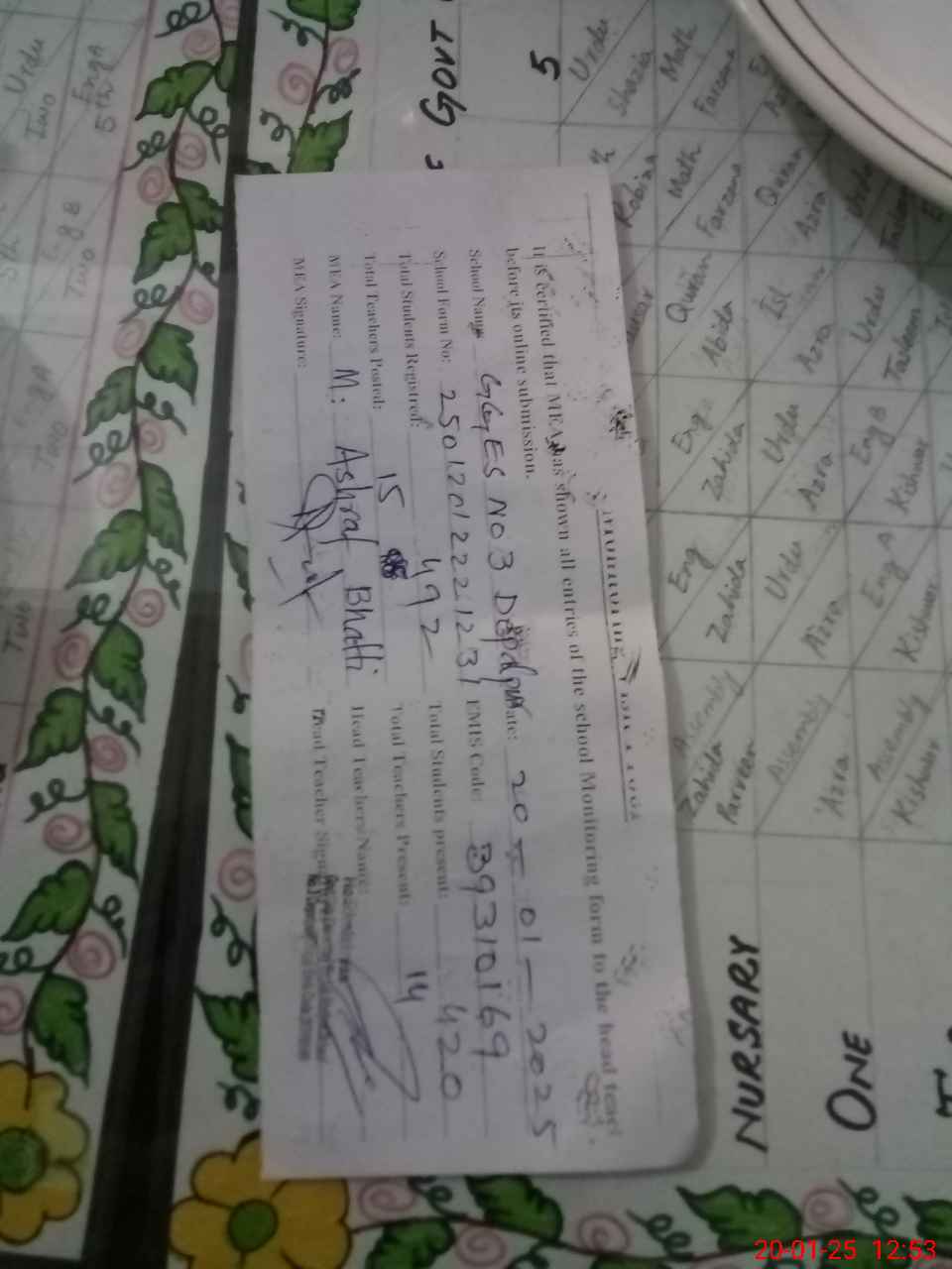 | Attendance Register | Head Teacher | MEA with School | Visit Proof |