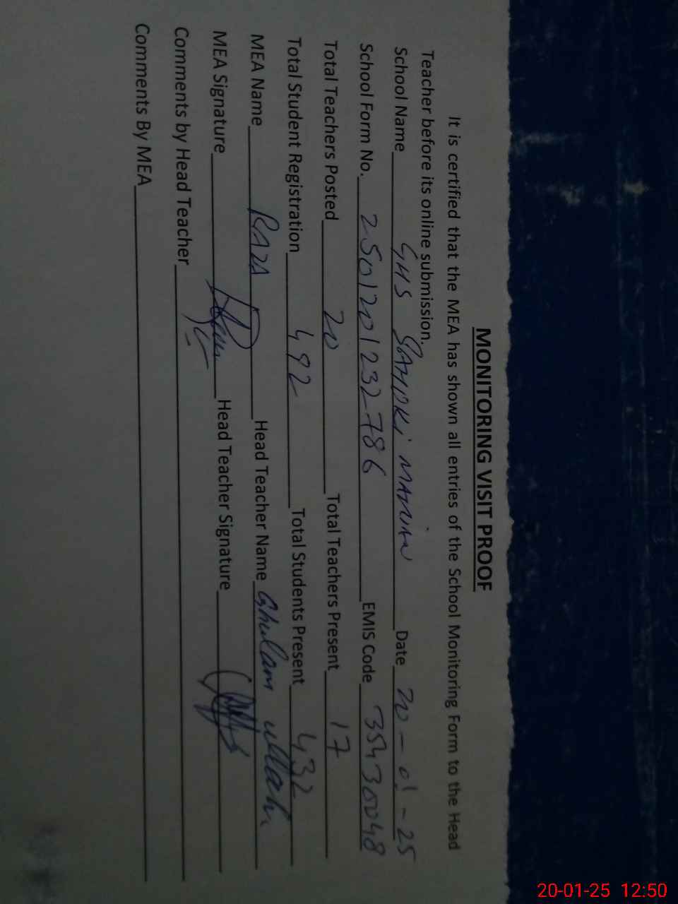 | Attendance Register | Head Teacher | MEA with School | Visit Proof |