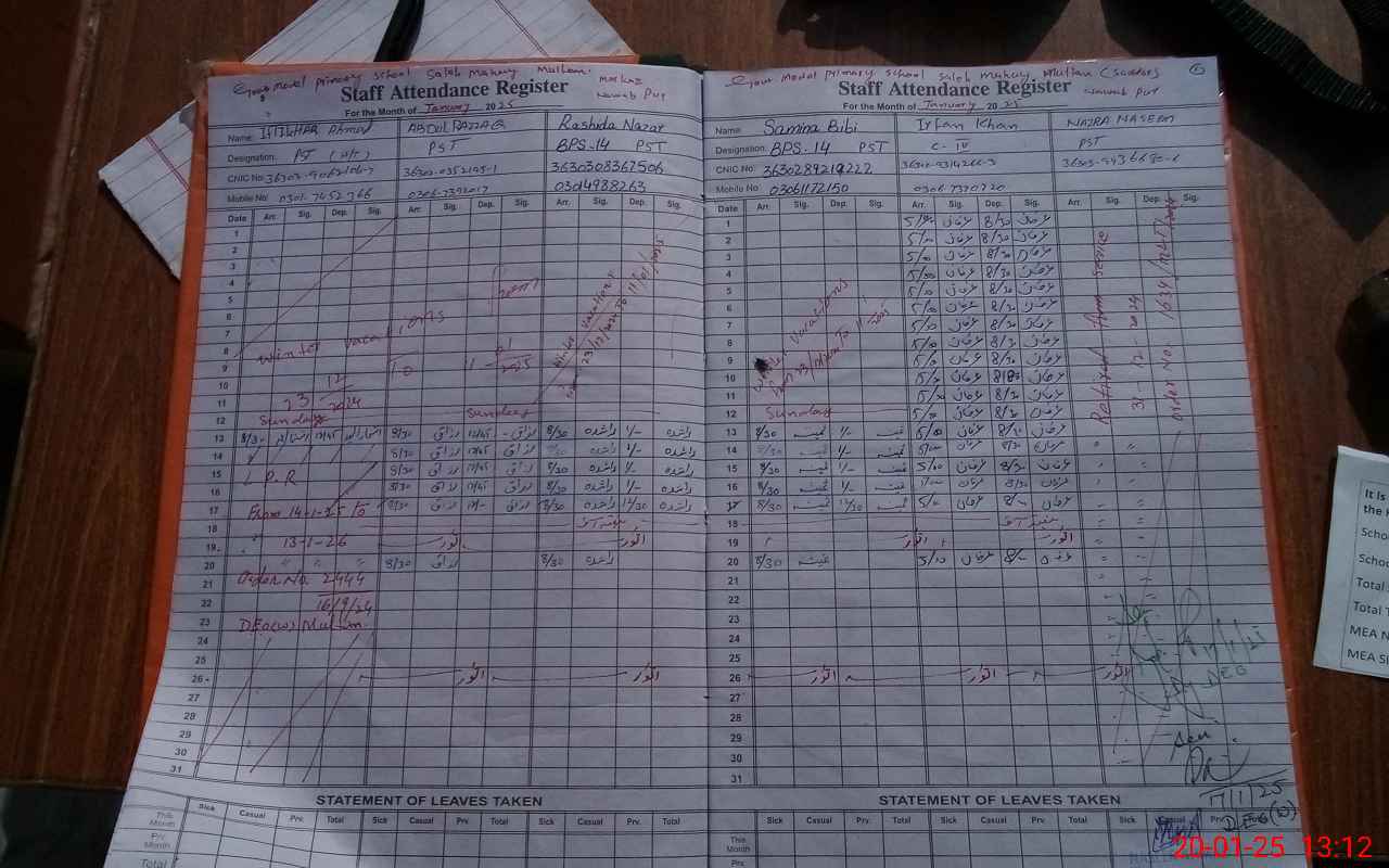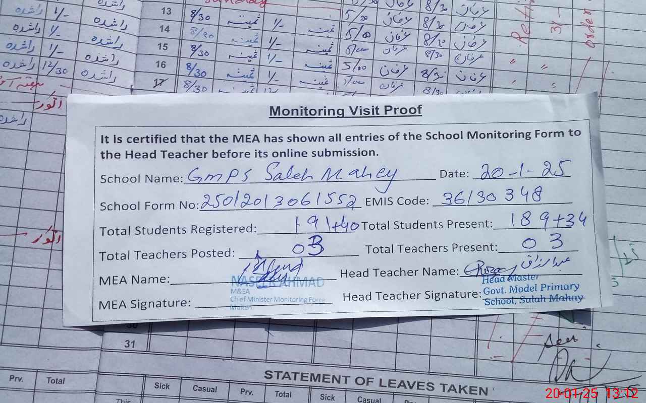 | Attendance Register | Head Teacher | MEA with School | Visit Proof |