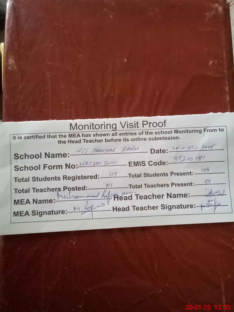 | Attendance Register | Head Teacher | MEA with School | Visit Proof |