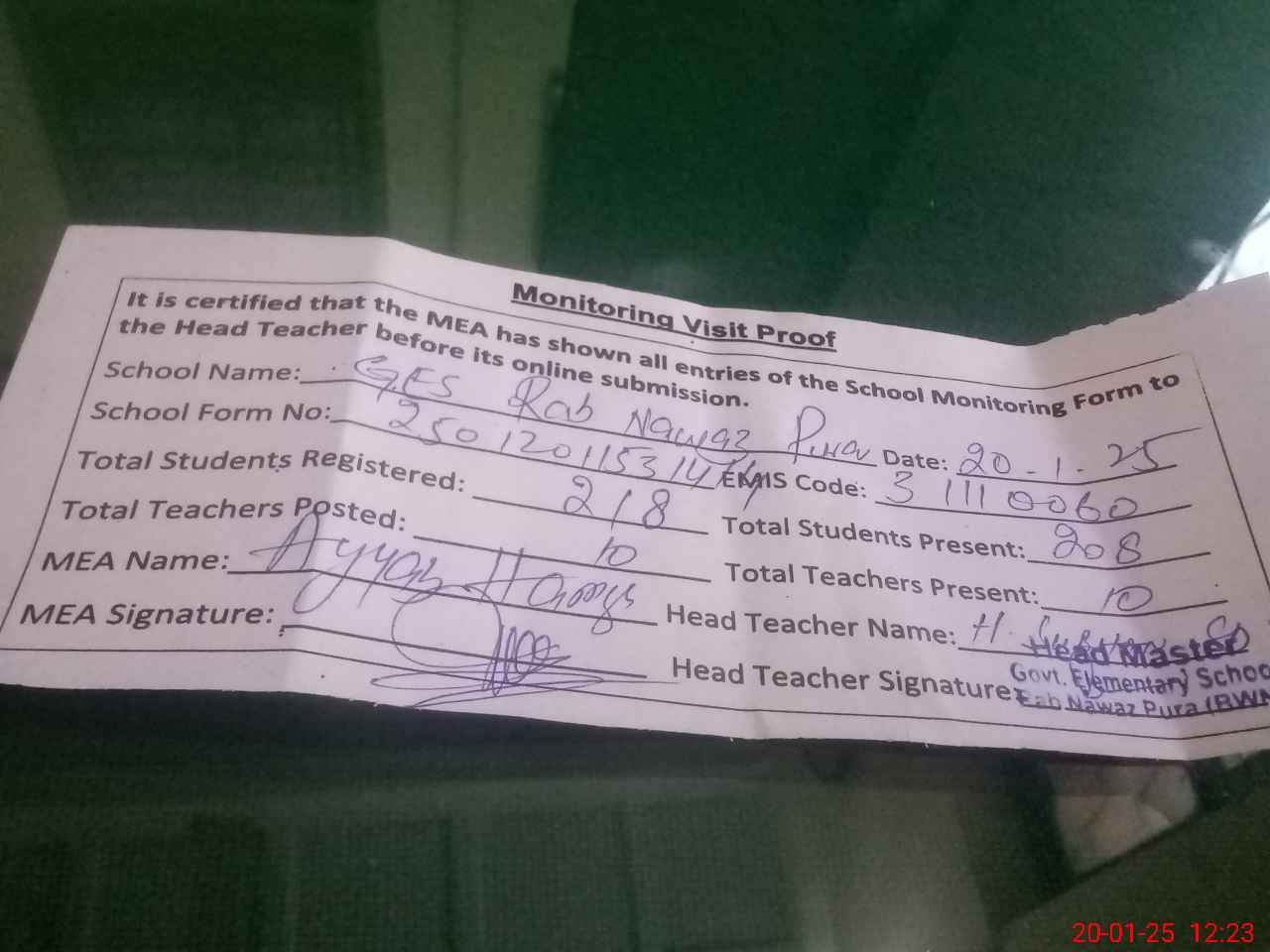 | EMIS Code: 31110060 | Name of School: GES RAB NAWAZ PURA | |||