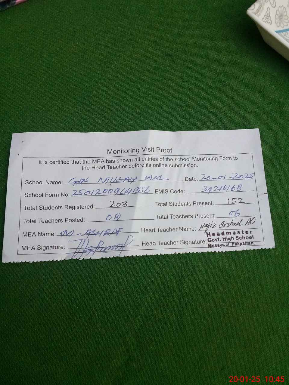 | Attendance Register | Head Teacher | MEA with School | Visit Proof |