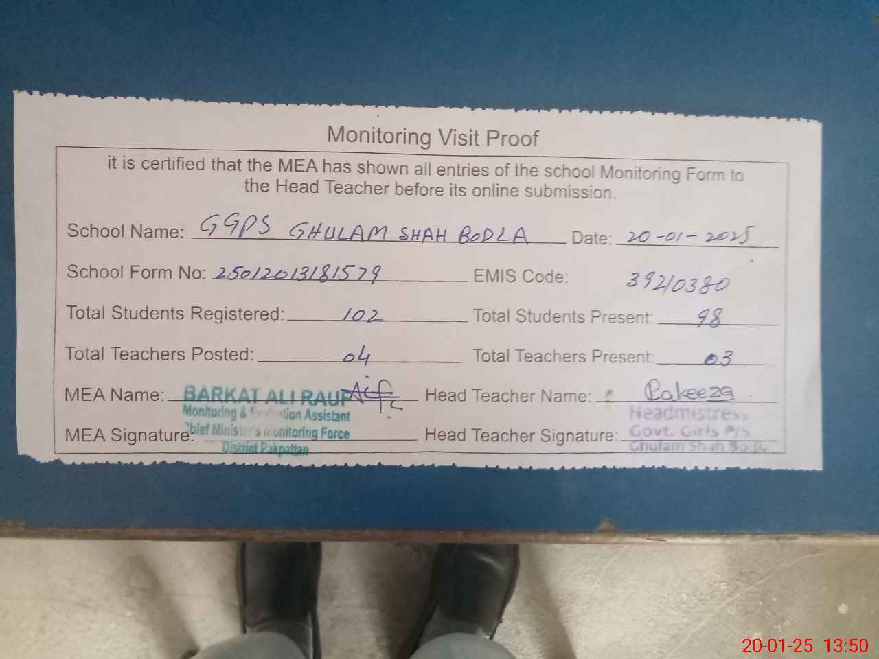 | Attendance Register | Head Teacher | MEA with School | Visit Proof |