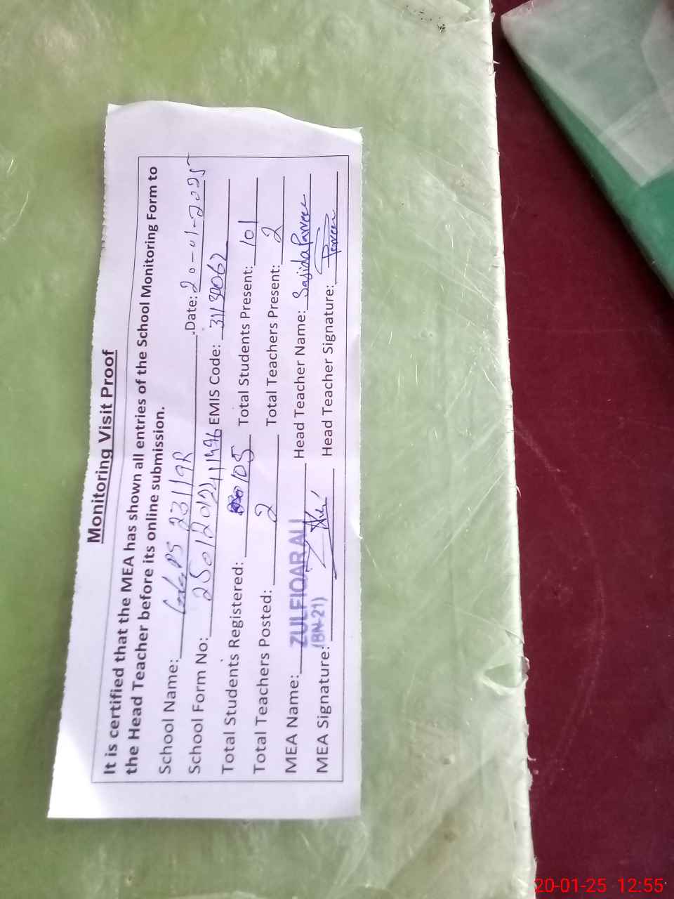 | Attendance Register | Head Teacher | MEA with School | Visit Proof |