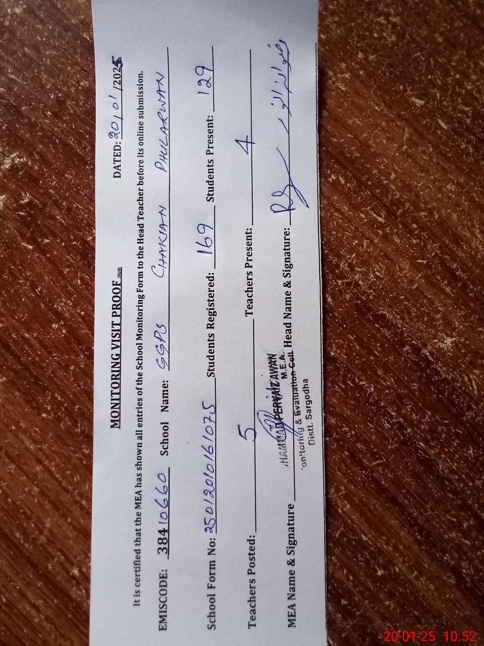 | Attendance Register | Head Teacher | MEA with School | Visit Proof |