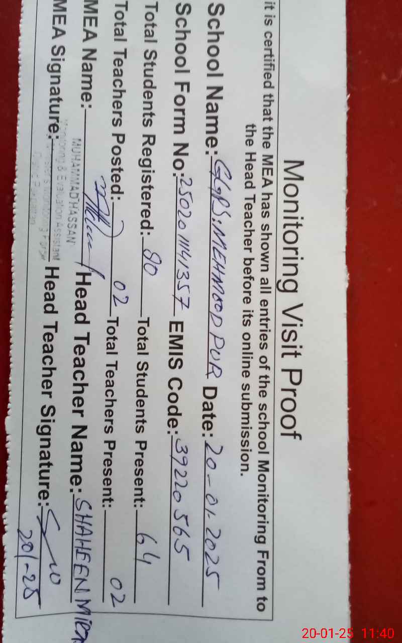 | EMIS Code: 39220565 | Name of School: GGPS MEHMOOD PUR | |||