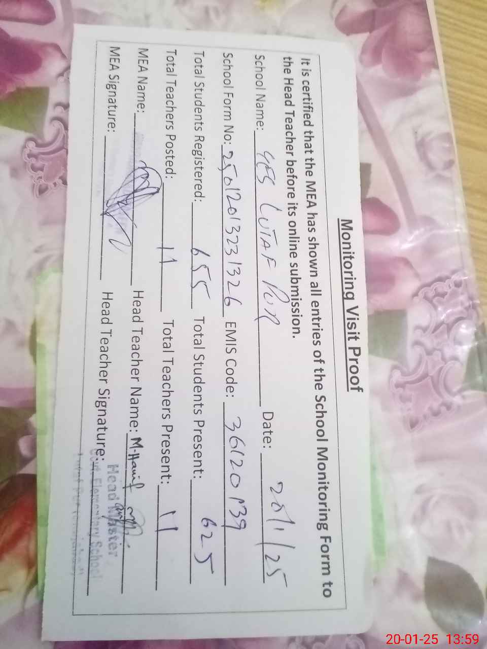 | Attendance Register | Head Teacher | MEA with School | Visit Proof |