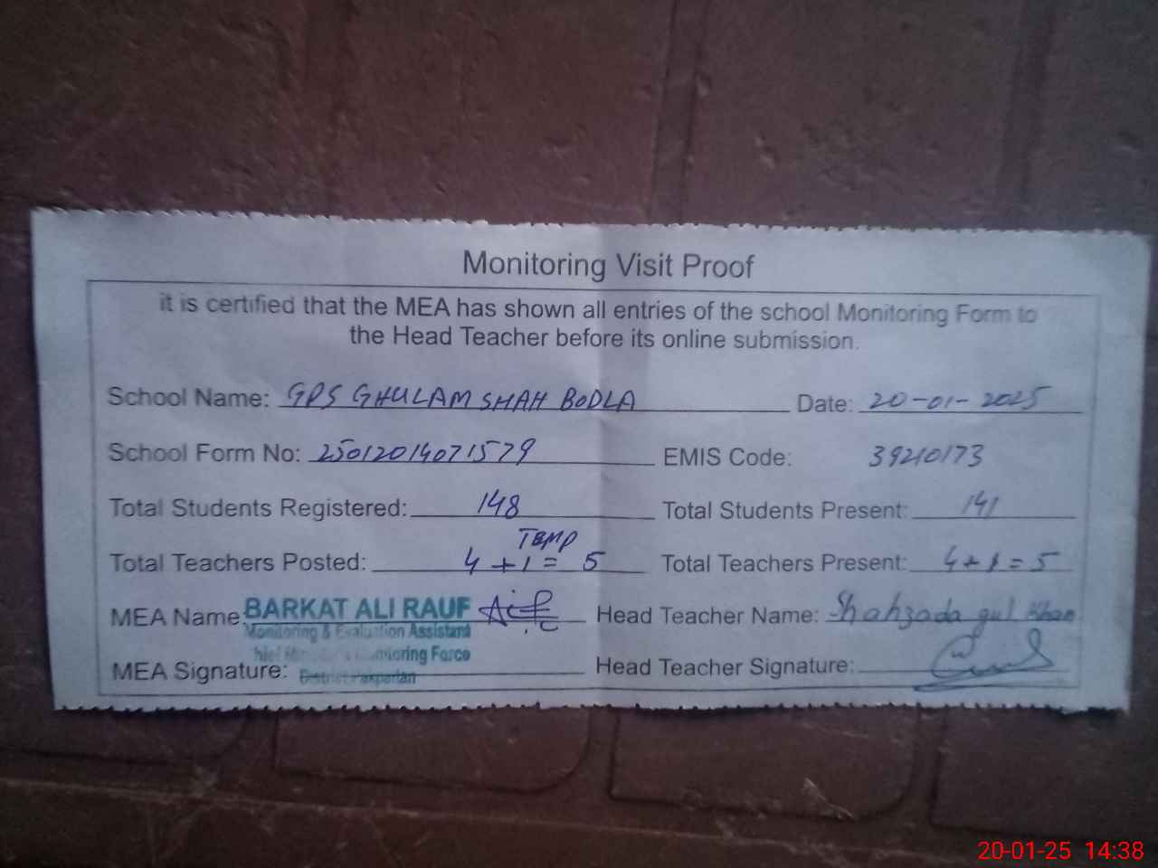 | Attendance Register | Head Teacher | MEA with School | Visit Proof |