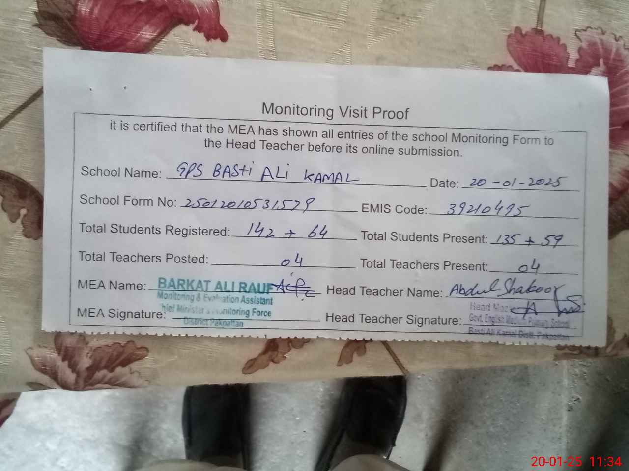| Attendance Register | Head Teacher | MEA with School | Visit Proof |