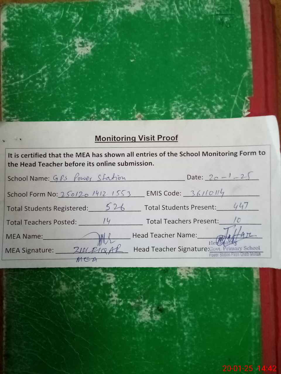 | Attendance Register | Head Teacher | MEA with School | Visit Proof |