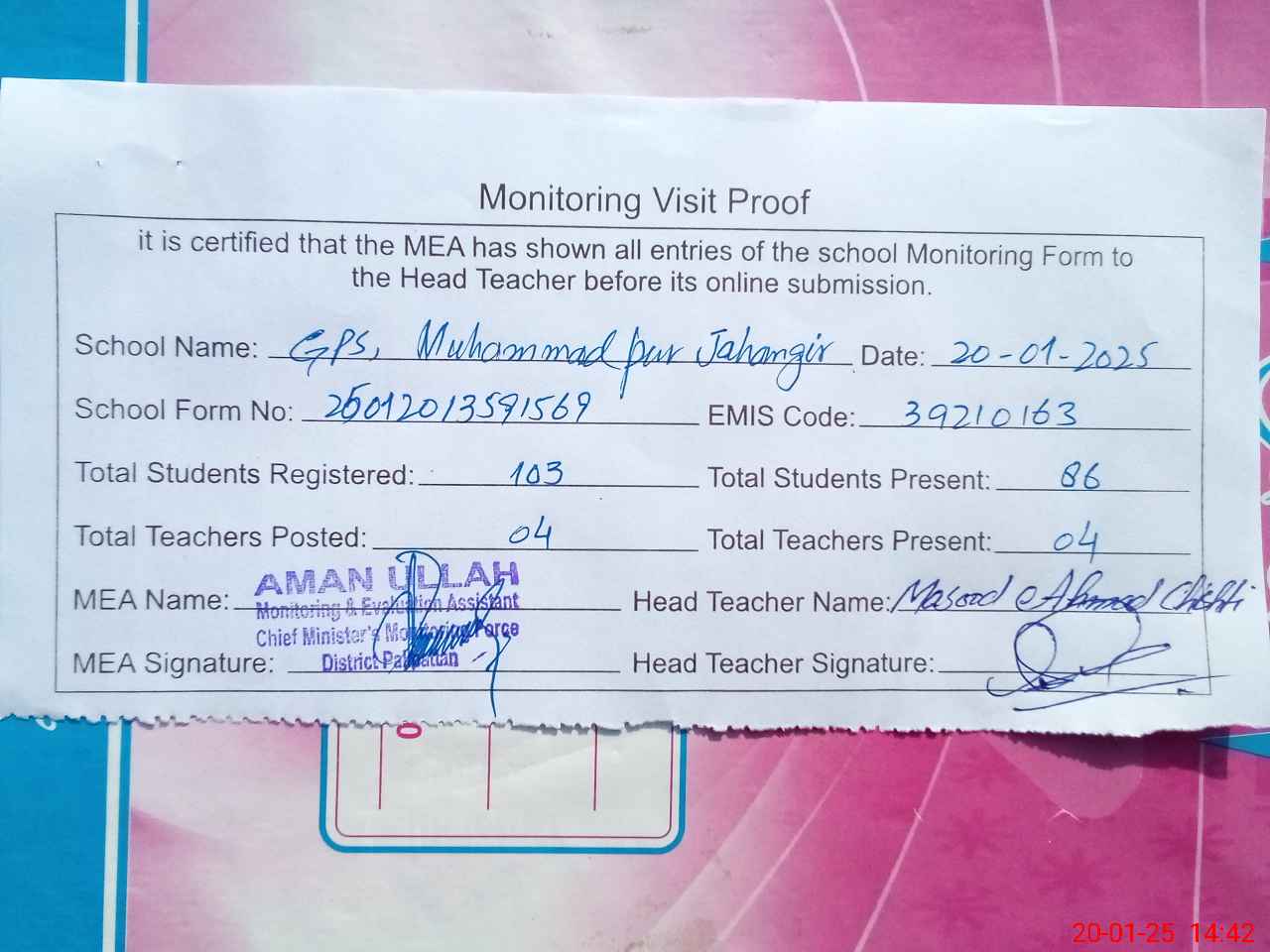 | EMIS Code: 39210163 | Name of School: GPS MUHAMMAD PUR JAGEER PO PAKPATTAN | |||