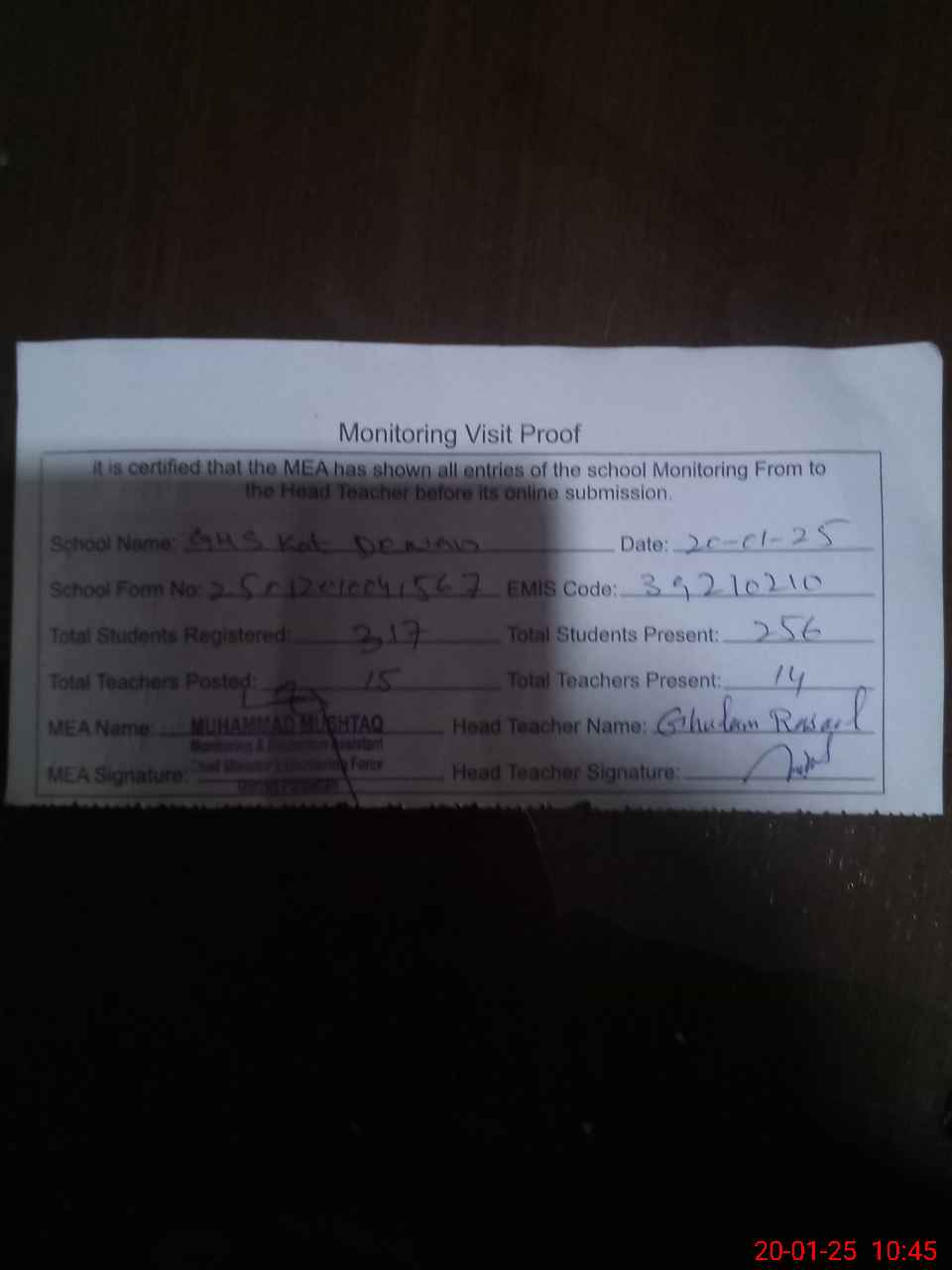 | Attendance Register | Head Teacher | MEA with School | Visit Proof |