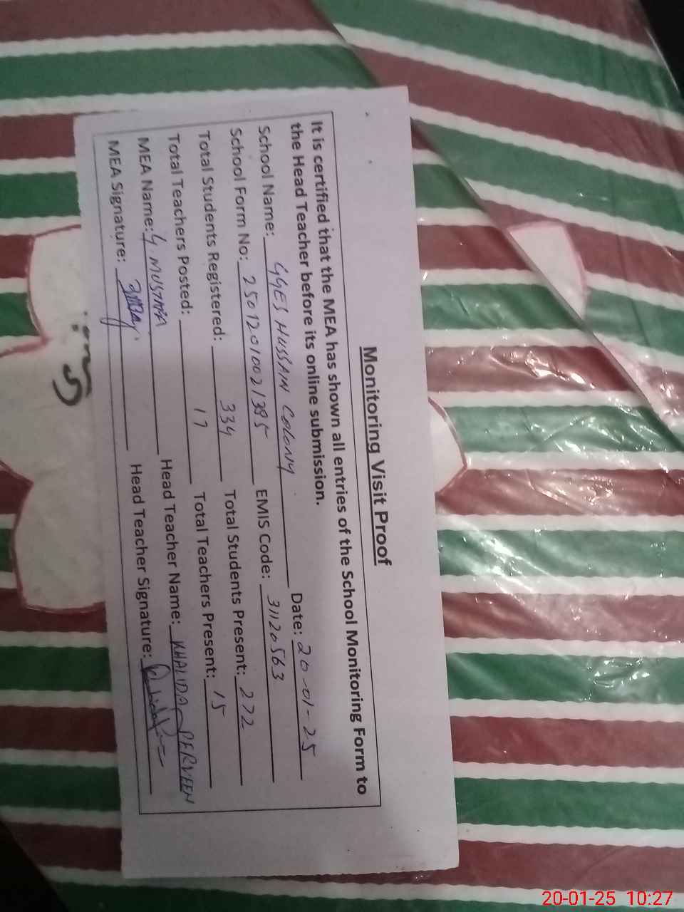 | Attendance Register | Head Teacher | MEA with School | Visit Proof |