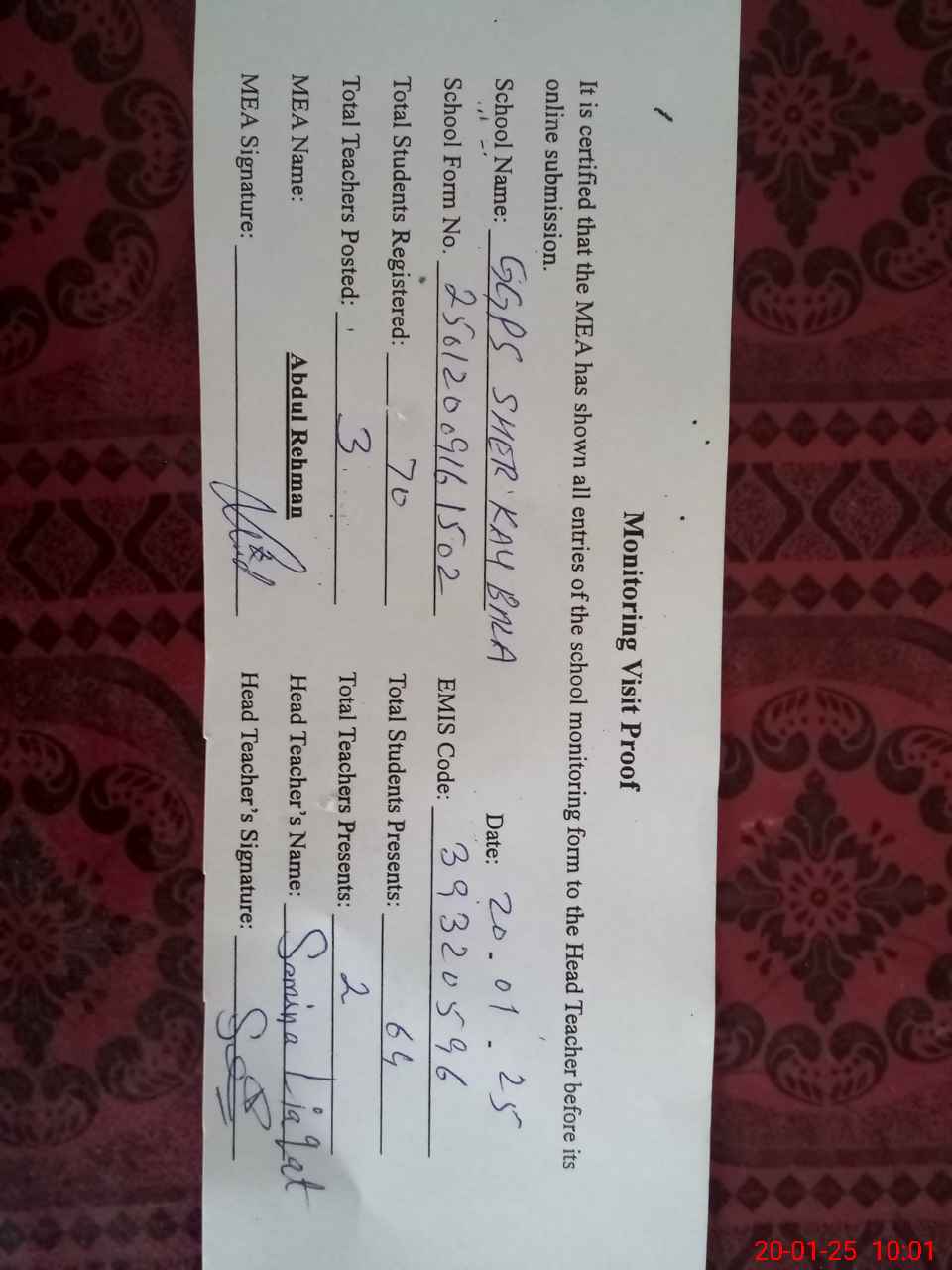 | Attendance Register | Head Teacher | MEA with School | Visit Proof |