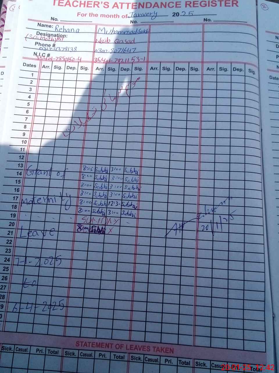 | CNIC | Full Name | Designation | R/C | Absence During Last Calender Month |