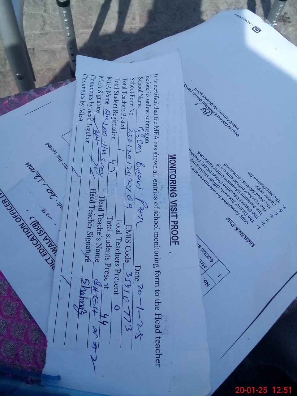 | Attendance Register | Head Teacher | MEA with School | Visit Proof |