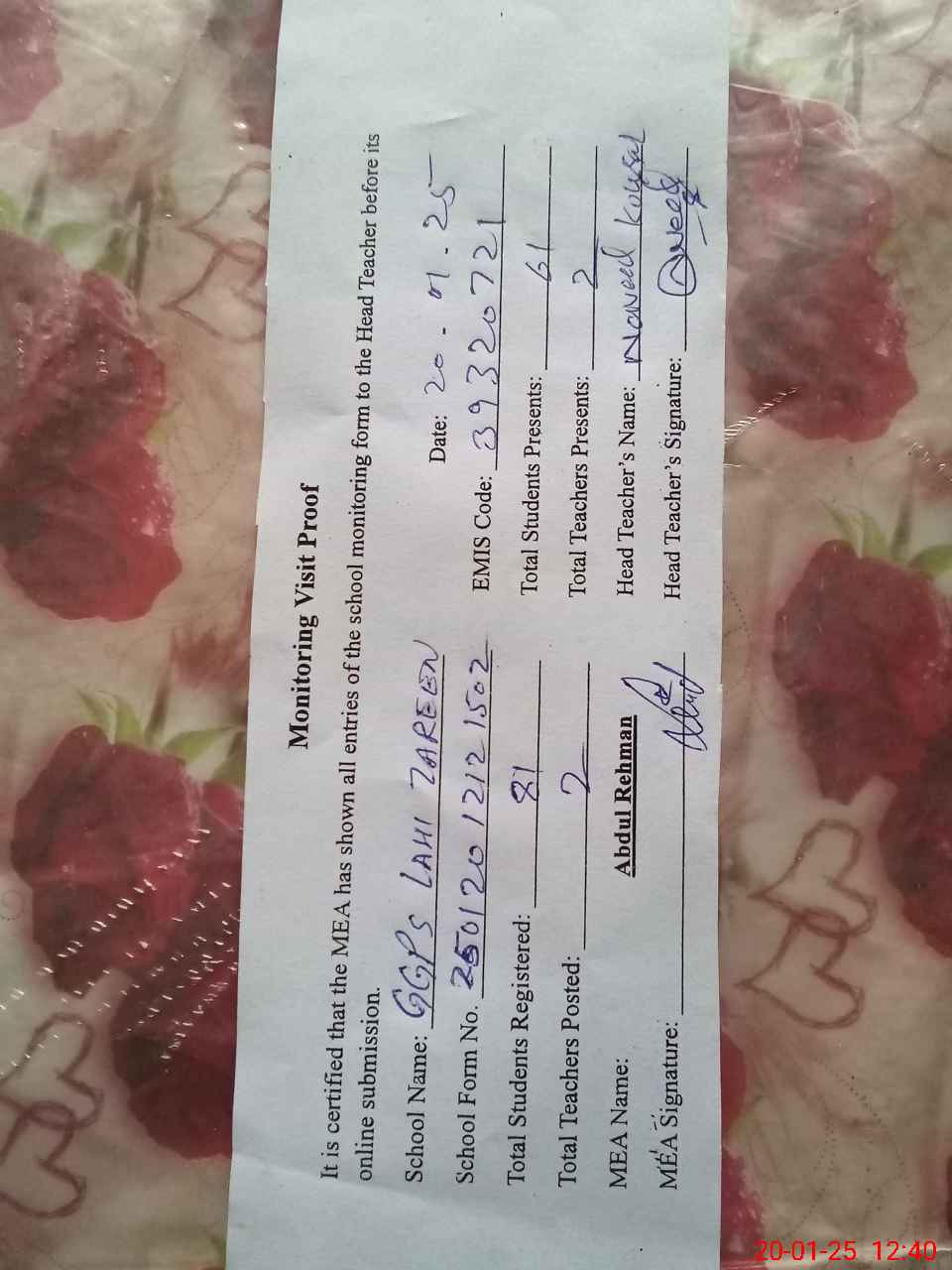 | Attendance Register | Head Teacher | MEA with School | Visit Proof |