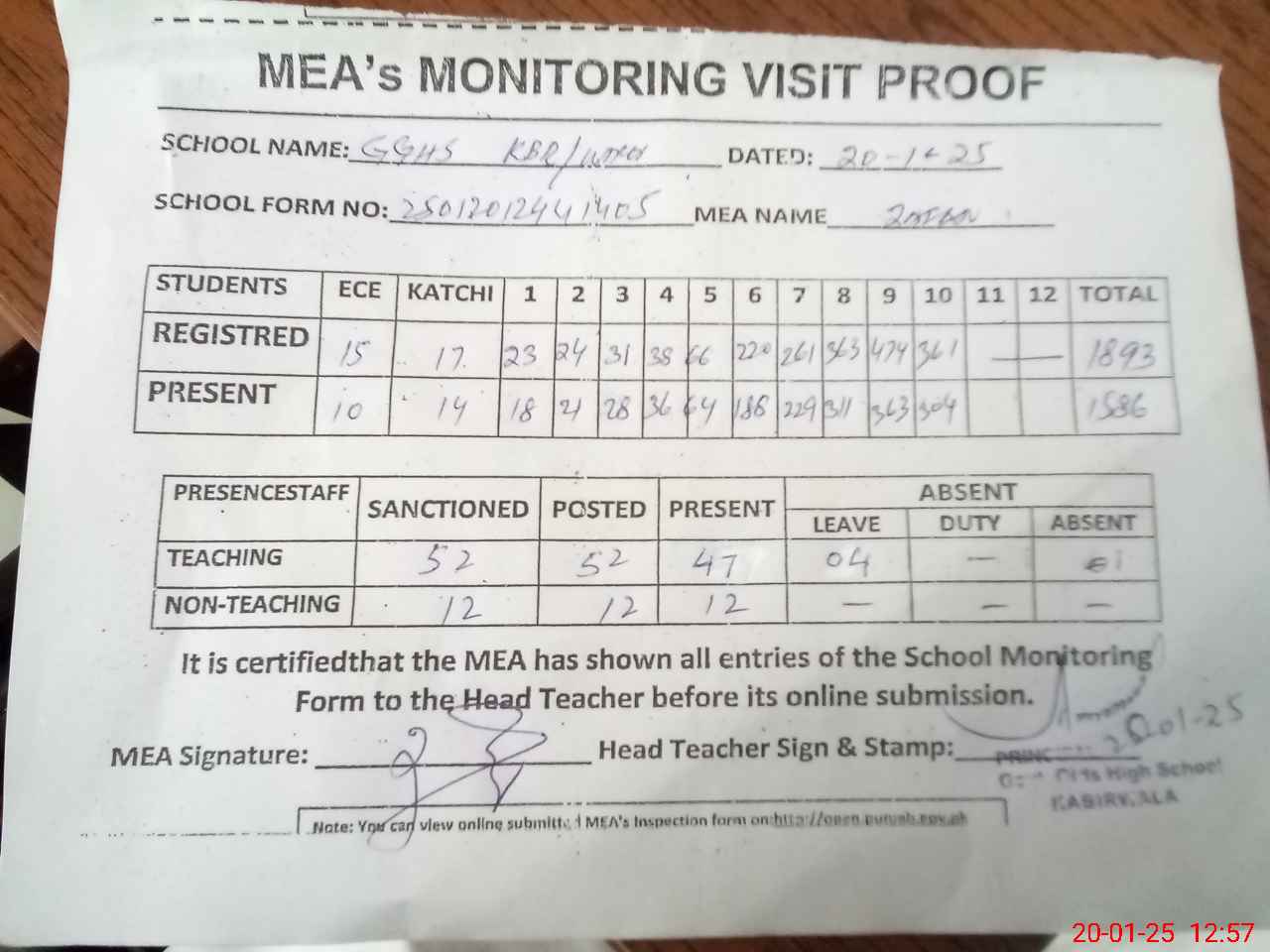 | Attendance Register | Head Teacher | MEA with School | Visit Proof |