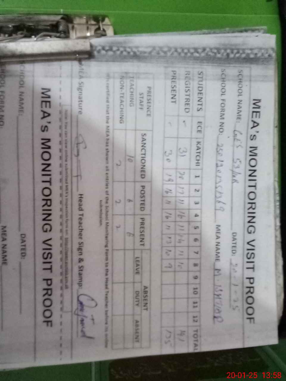 | Attendance Register | Head Teacher | MEA with School | Visit Proof |
