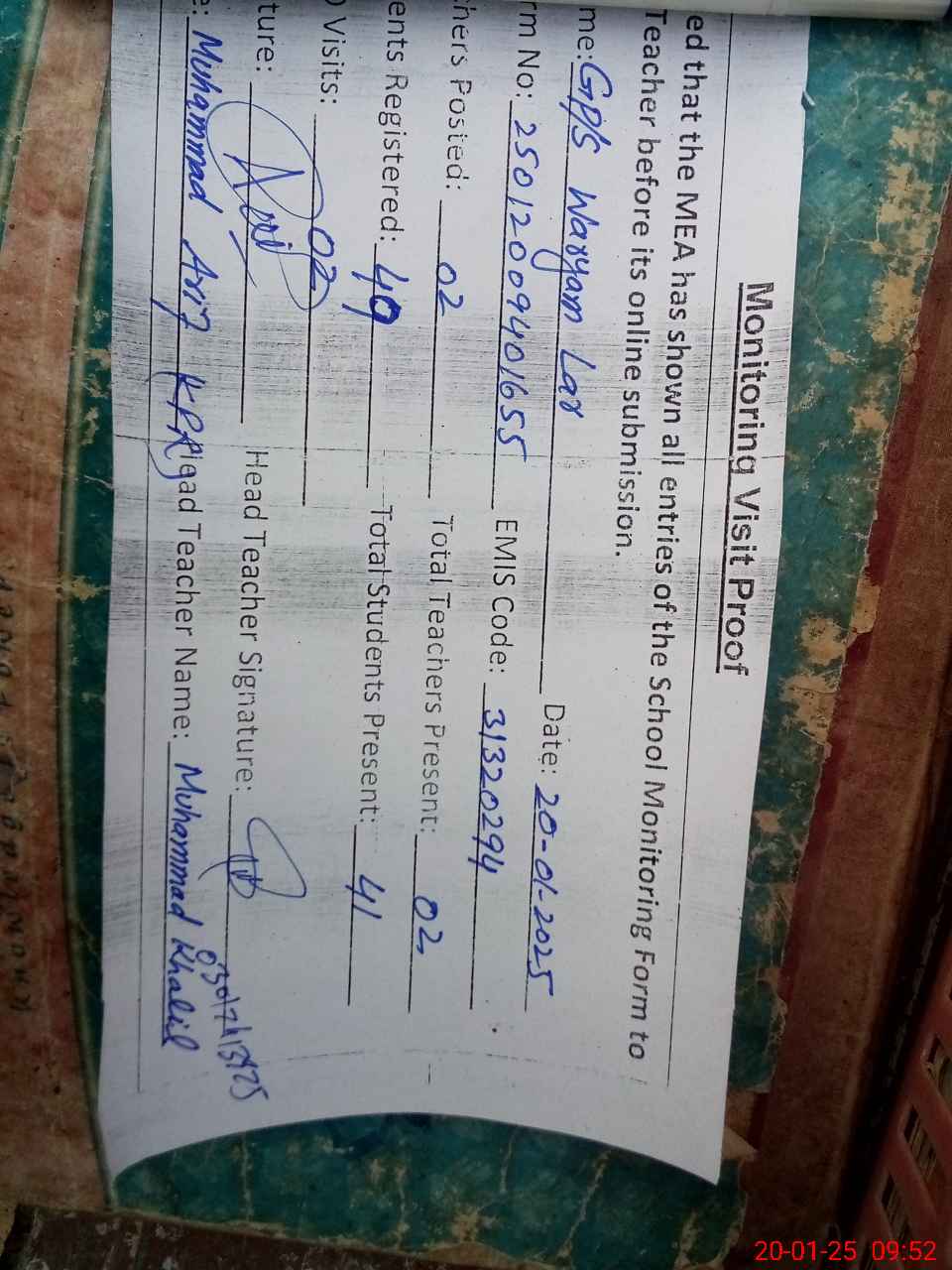 | Attendance Register | Head Teacher | MEA with School | Visit Proof |