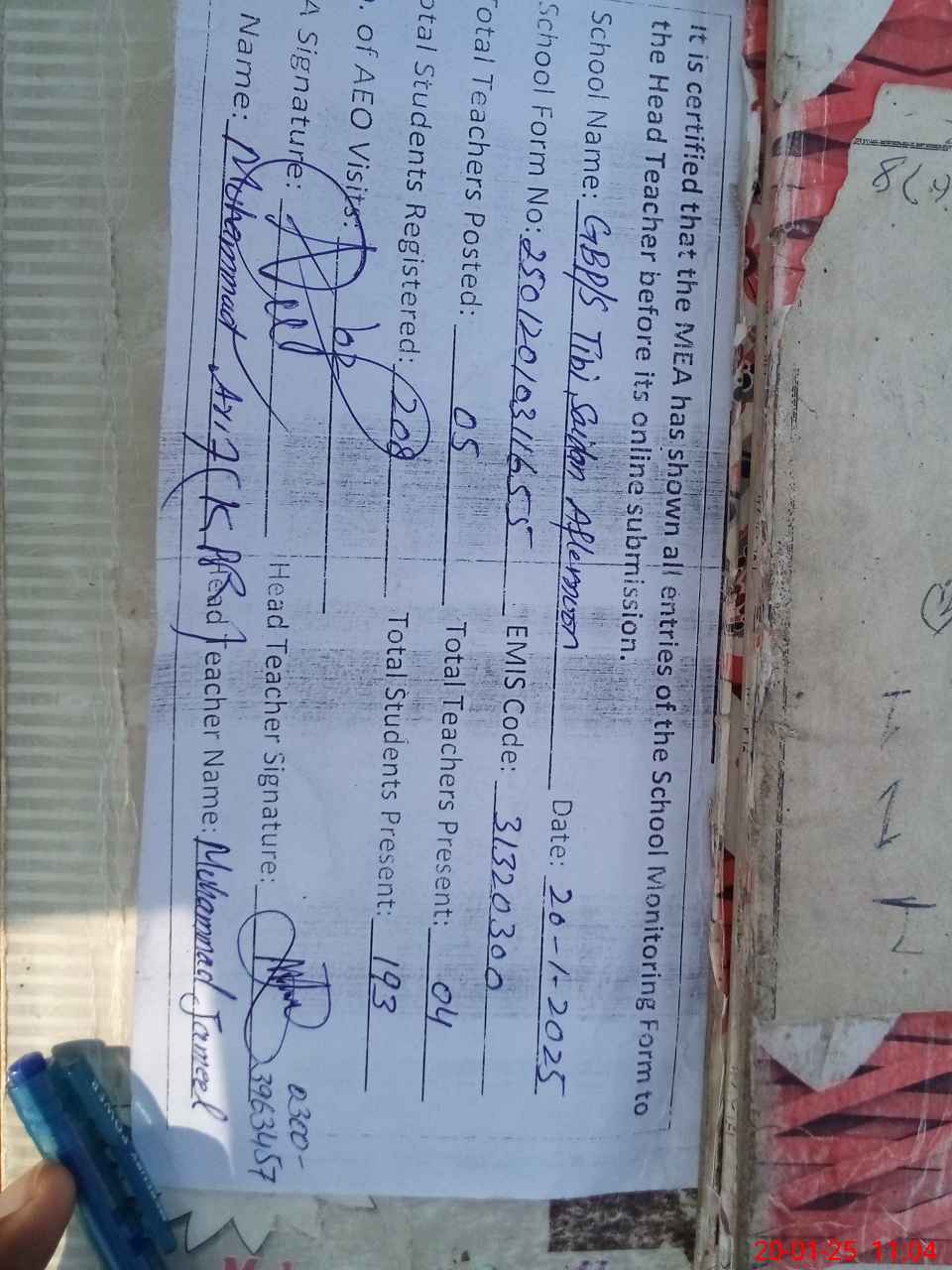 | Name: MU**** JA**** Designation: (School Headmaster's/Headmistress's) PST/PTC/JV Phone/Cell Number: 03**** |