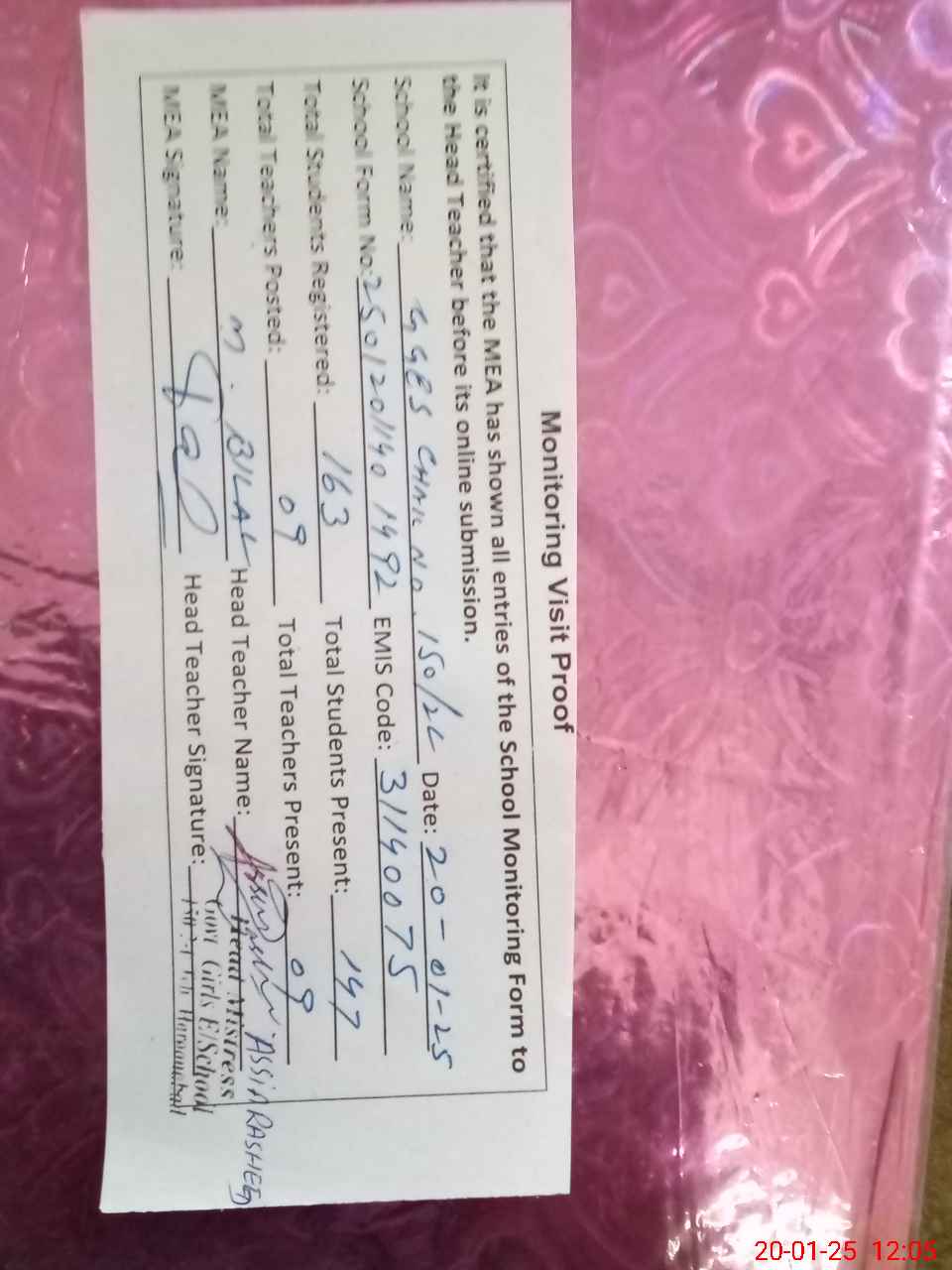 | Attendance Register | Head Teacher | MEA with School | Visit Proof |