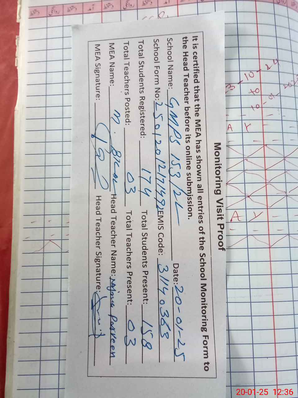 | Attendance Register | Head Teacher | MEA with School | Visit Proof |