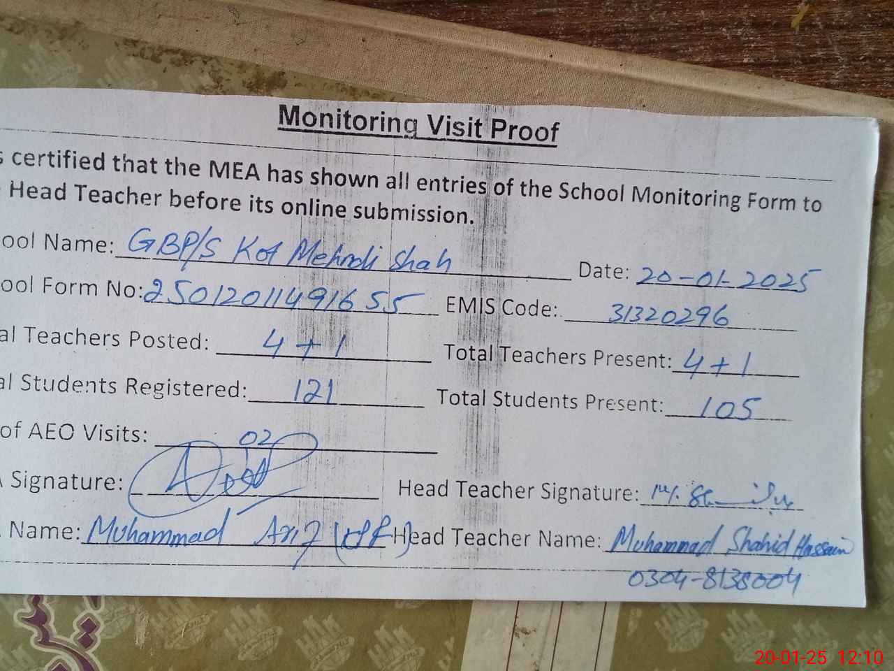 | Attendance Register | Head Teacher | MEA with School | Visit Proof |