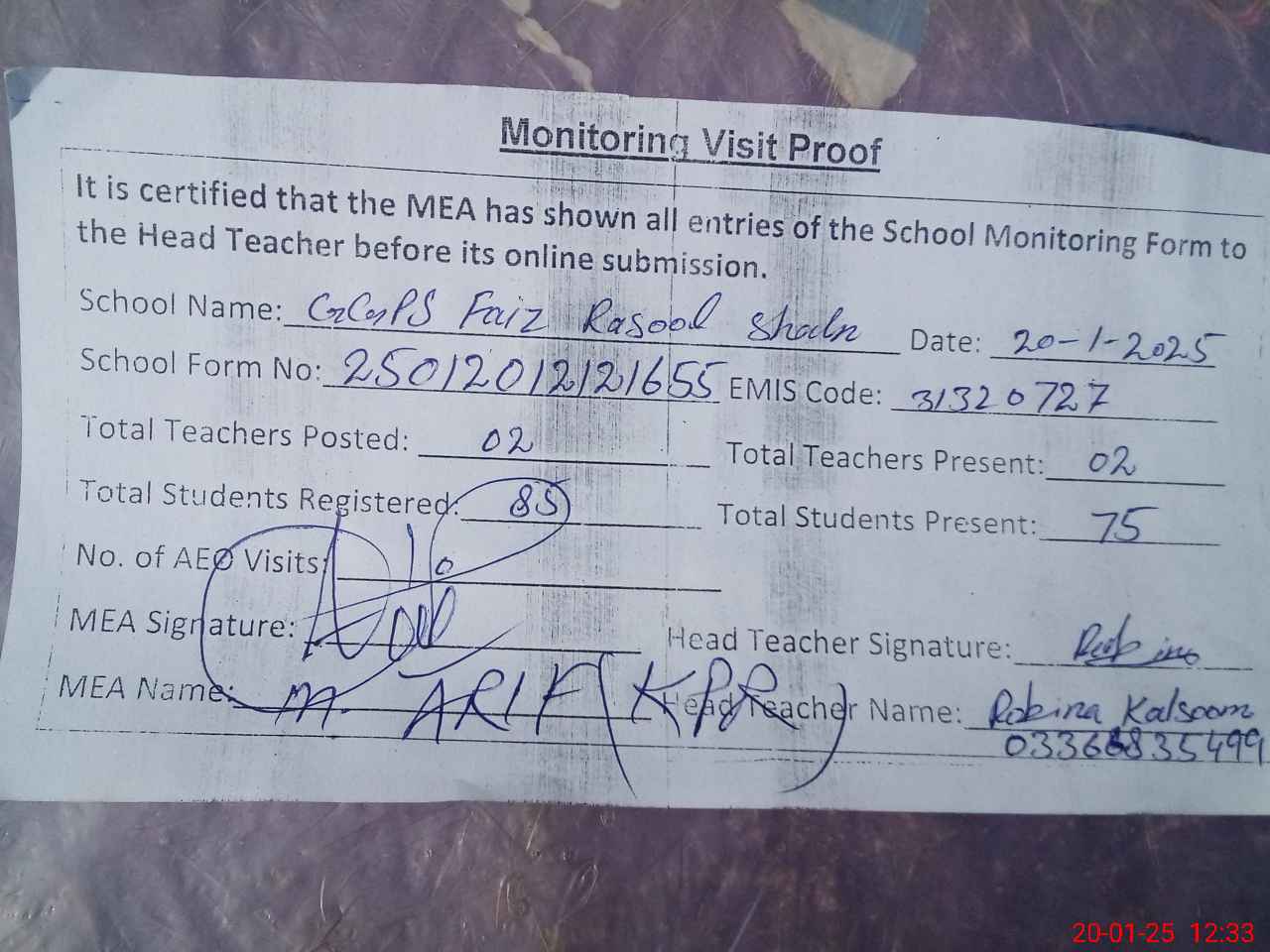 | EMIS Code: 31320727 | Name of School: GGPS FAIZ RASOOL SHAH | |||