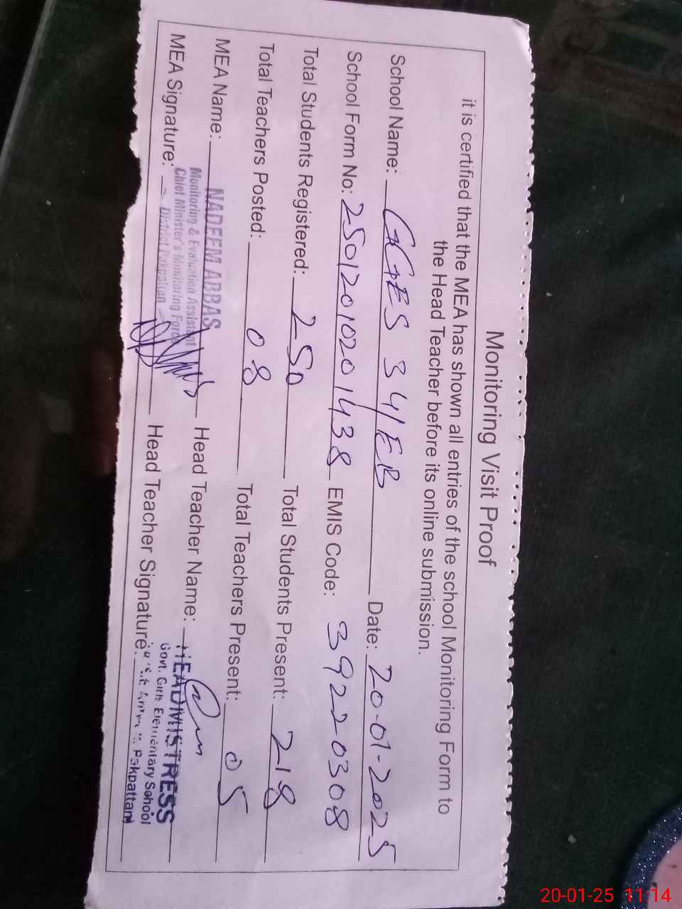 | Attendance Register | Head Teacher | MEA with School | Visit Proof |