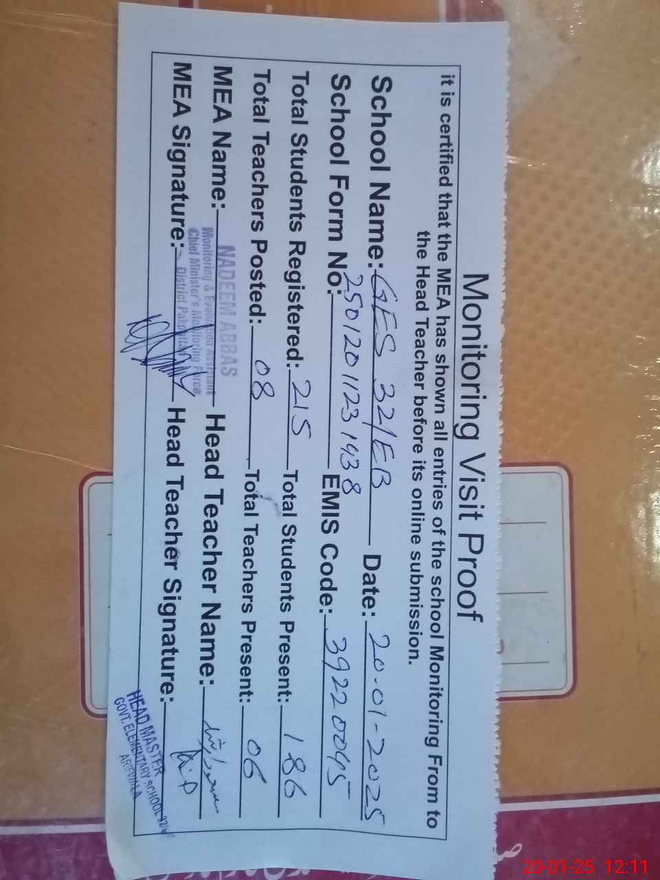 | Attendance Register | Head Teacher | MEA with School | Visit Proof |