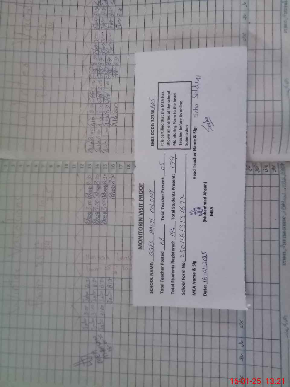 | Attendance Register | Head Teacher | MEA with School | Visit Proof |