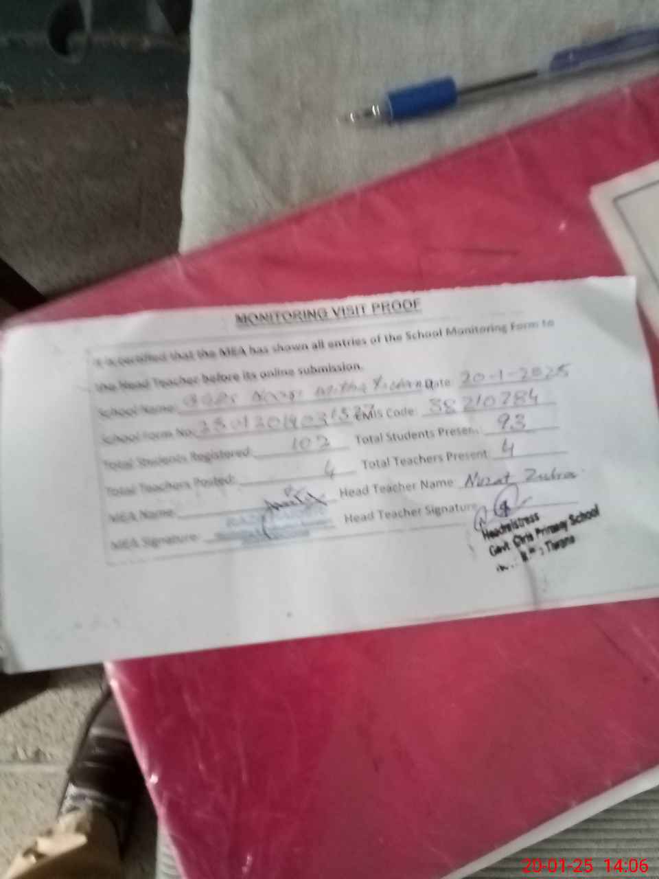 | Attendance Register | Head Teacher | MEA with School | Visit Proof |
