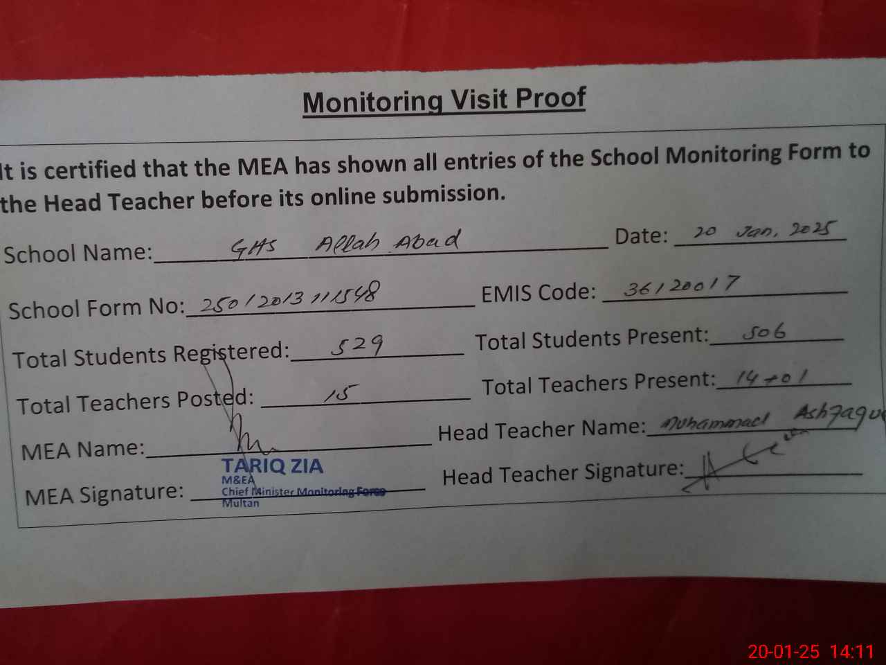 | Attendance Register | Head Teacher | MEA with School | Visit Proof |