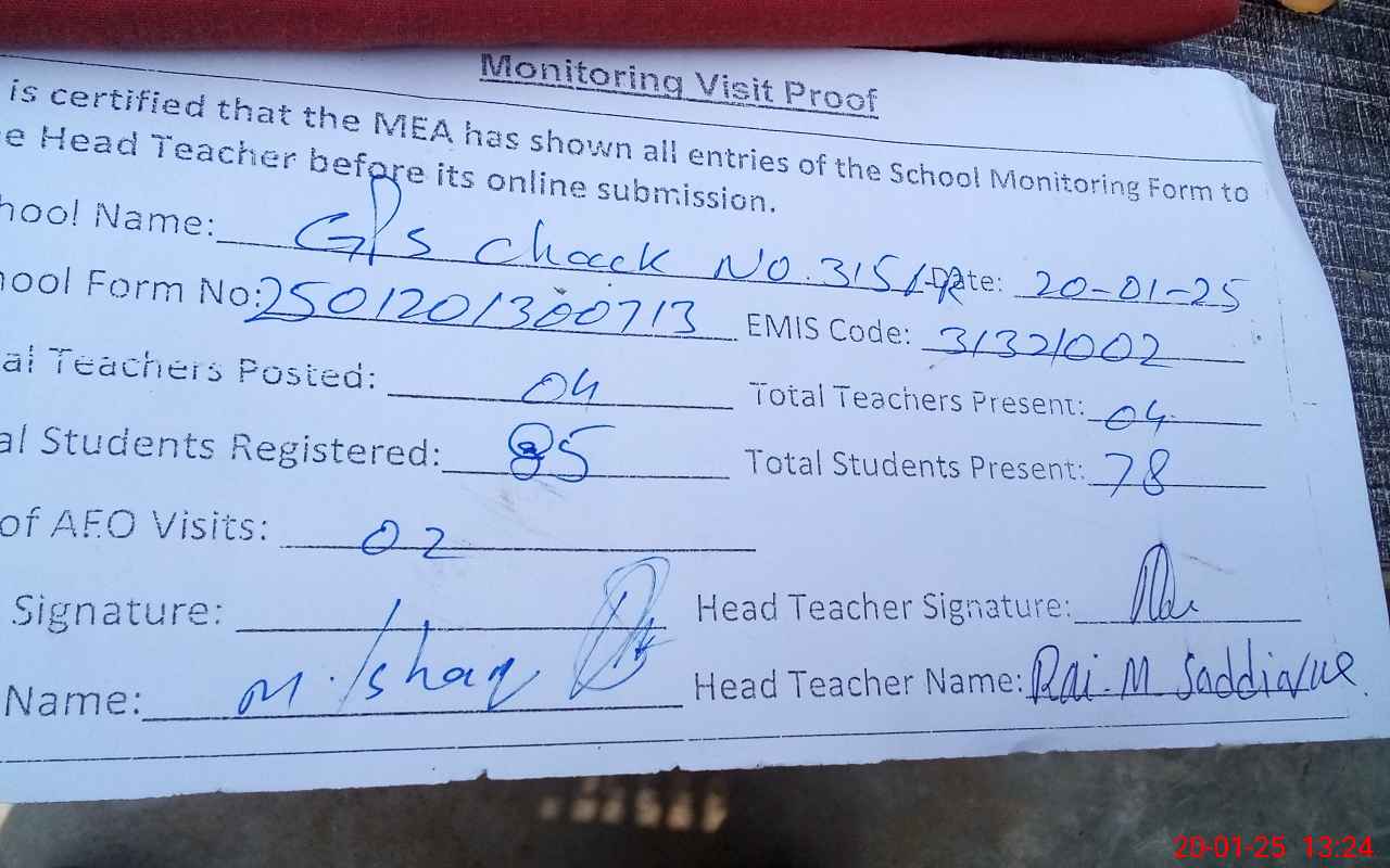 | EMIS Code: 31321002 | Name of School: GPS CHAK NO.315 | |||