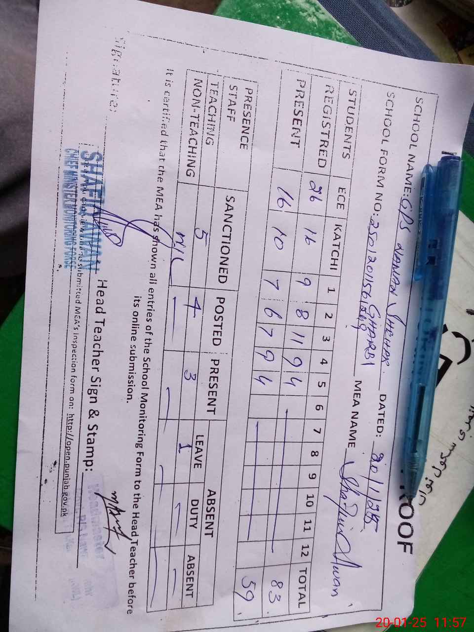 | Attendance Register | Head Teacher | MEA with School | Visit Proof |