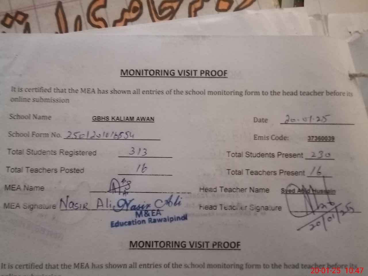 | Attendance Register | Head Teacher | MEA with School | Visit Proof |