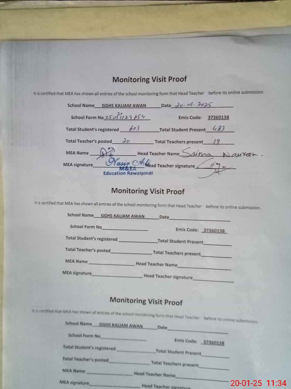 | Attendance Register | Head Teacher | MEA with School | Visit Proof |