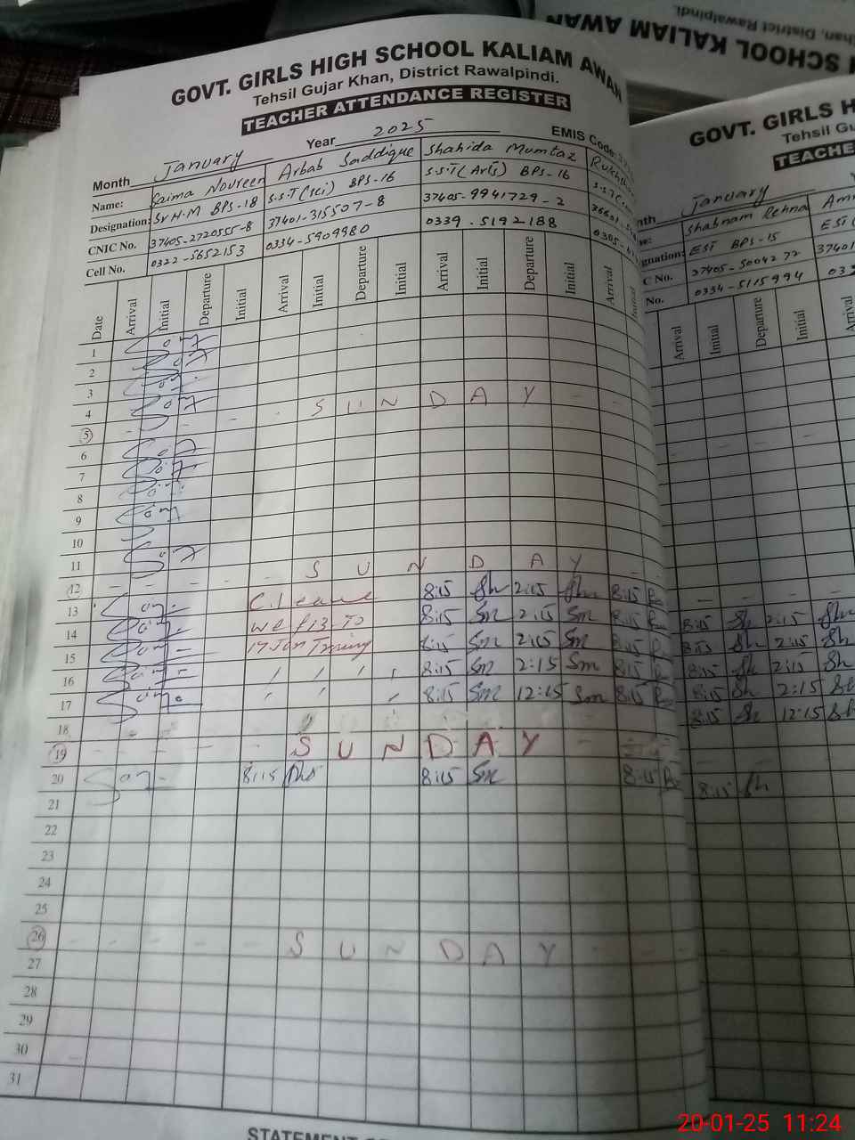 | CNIC | Full Name | Designation | R/C | Absence during last cal. month |