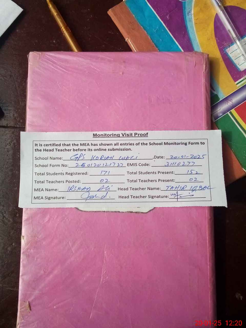 | Attendance Register | Head Teacher | MEA with School | Visit Proof |