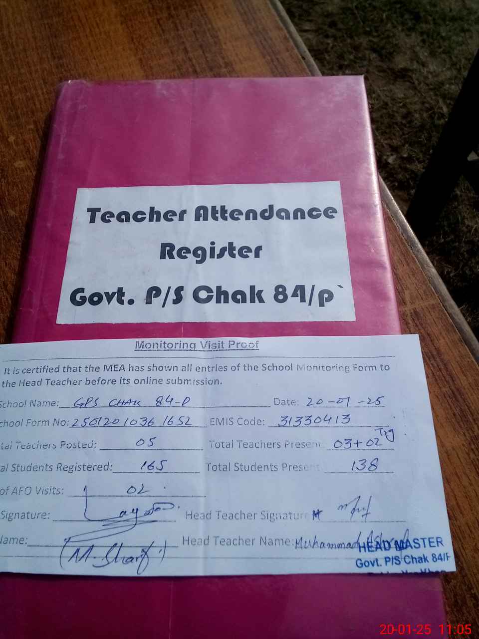 | Attendance Register | Head Teacher | MEA with School | Visit Proof |