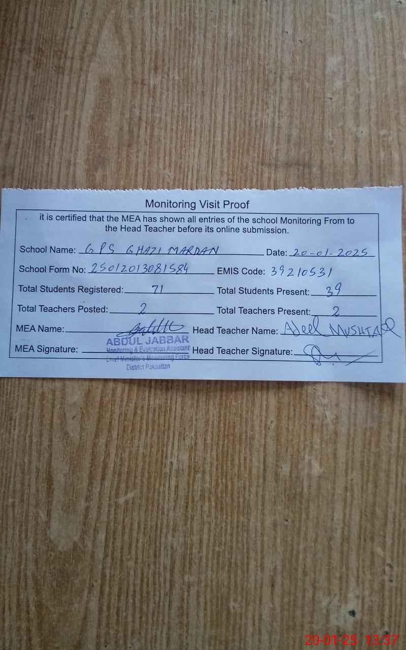 | EMIS Code: 39210531 | Name of School: GPS GHAZI MARDAN P/O CHAK BEDI | |||